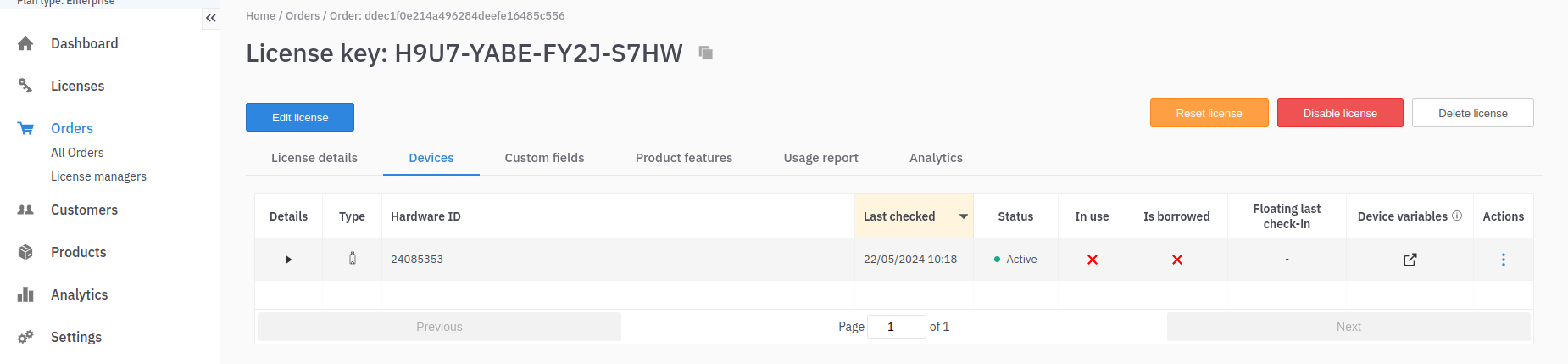In the floating server, when the hardware key is plugged in and a license-requiring hardware key is added to the floating server, the server's hardware ID changes to the serial number of the hardware key. From then on, every other action in this server uses the new hardware ID, as long as the hardware key is connected to the server. Multiple licenses can be activated using the same hardware key.