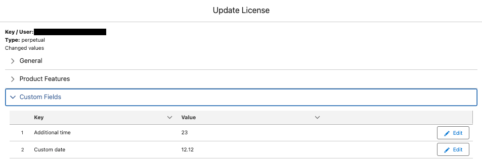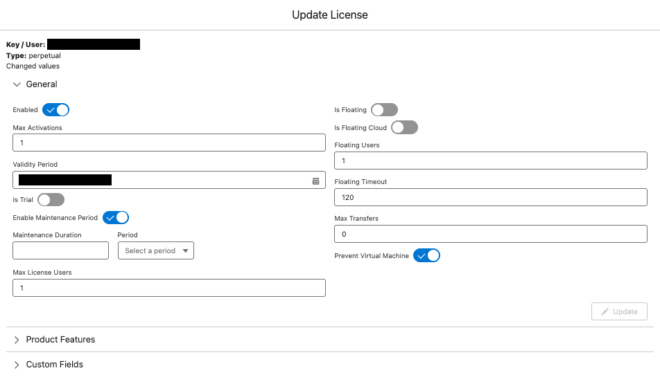 Once the contact has its licenses created, you have the ability to update some license parameters (depending on the license type you created).