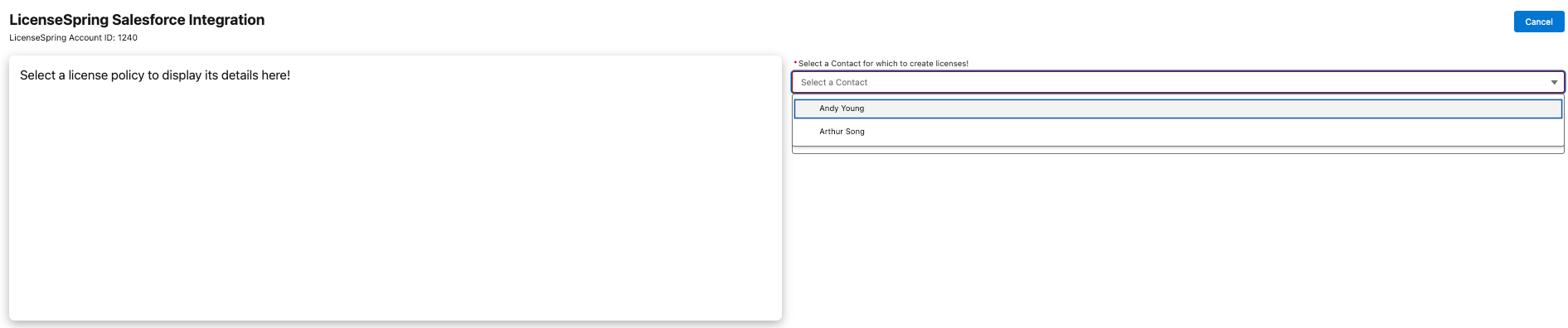 In this pop up window, in the drop down you need to select which customer to connect to from LicenseSpring. The drop down will only show you the customers that have the same name as your contact in SalesForce. Once you pick which customer you just need to click on the "Connect" button and that is it.