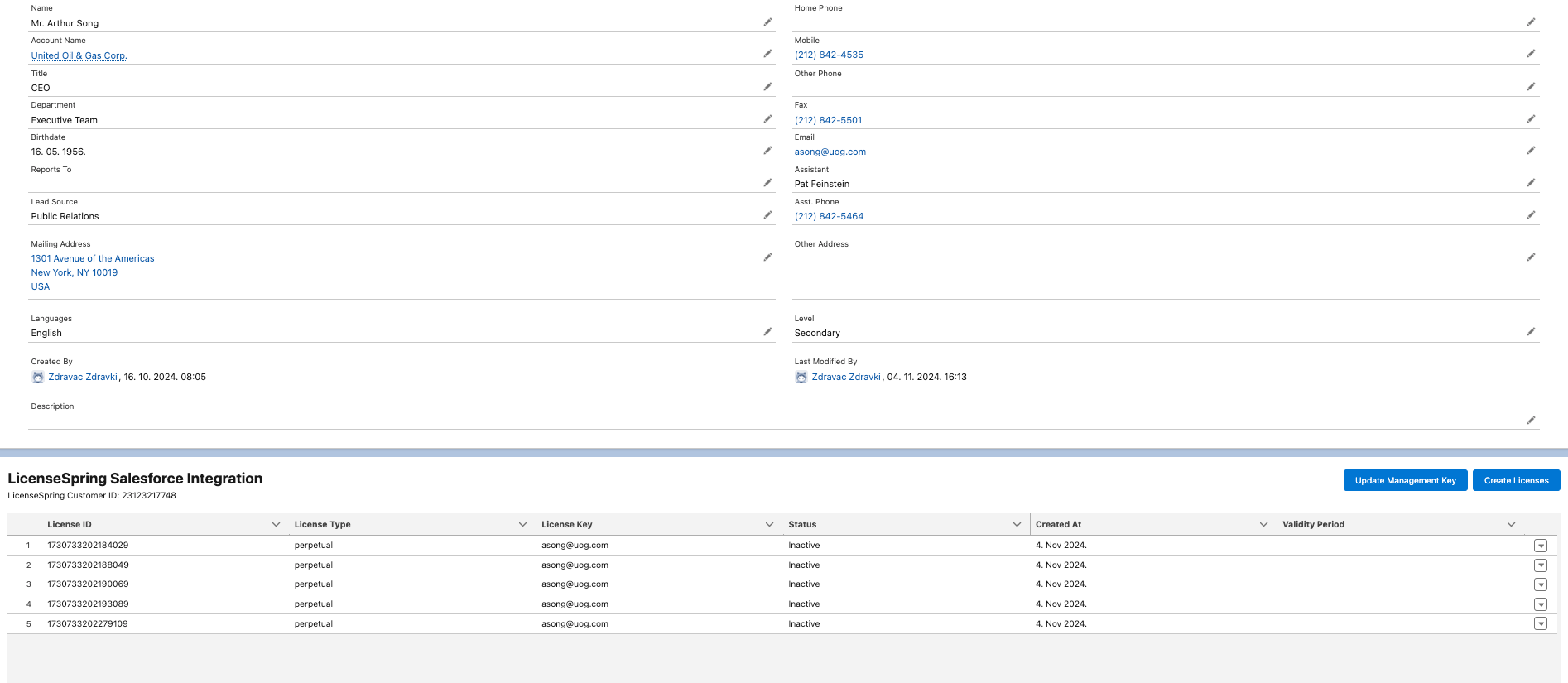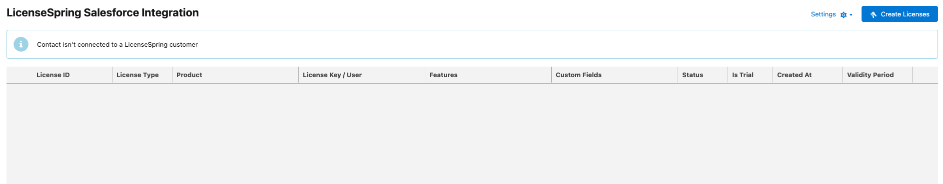 Initially the contact is not automatically connected to the co-responding customer in LicenseSpring (image below). Once you create a license on the contact, then all the periously created licenses for that contact will also show up in our integration, and moving forward you'll always see all the licenses on that co-responding contact.