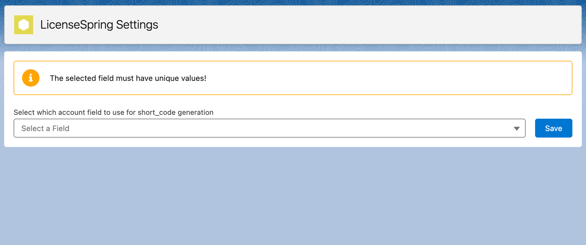 If you want the short code to be generated from a value other than the Account name, open LicenseSpring Settings and select a different unique Account field.