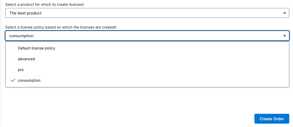 Once we select a Product, we will be able to pick a License Policy, and depening on the picked License Policy type we will see aditional settings below the drop down.