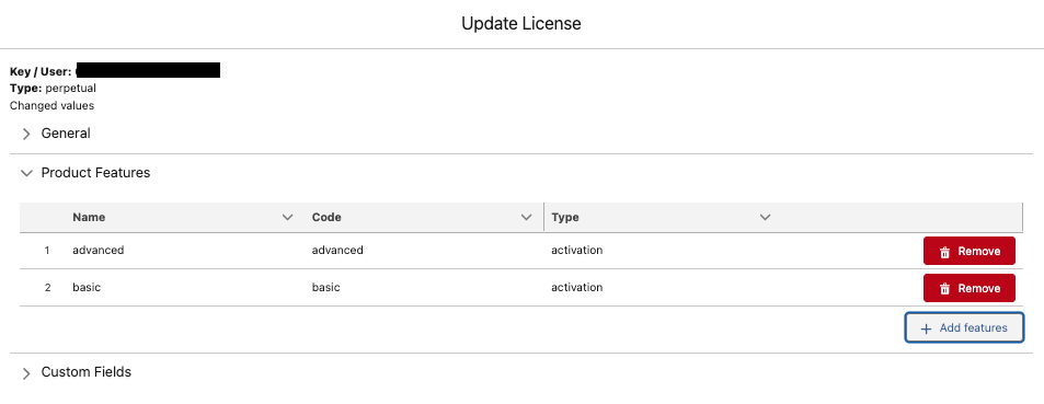If the product that your license is connected to has Product features, you will be able to add or remove them when your're updating your license.