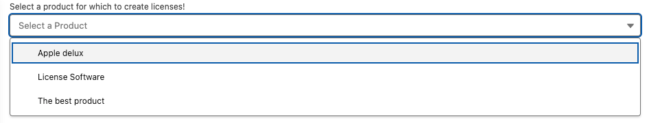 On this screen we are able to pick a product from our connected LicenseSpring instance.