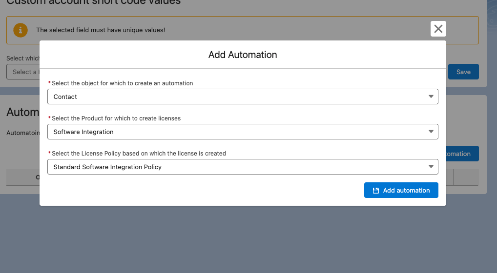 If you want licenses to be automatically created after an object (Lead, Contact, or Account) is created, you can configure this in the LicenseSpring Settings screen. There, you can select which object the automation applies to and specify the product and license policy to be used.