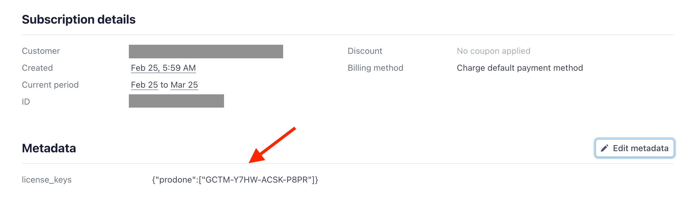 If you are creating Stripe subscriptions and invoices (in case of one time order, ex. perpetual licenses) manually without the ability to create the subscription or invoice with prefilled metadata then LicenseSpring will detect that metadata doesn't contain keys for the product in question and it will generate them automatically. Upon order create is finished, subscriptions / invoice metadata on Stripe will be updated with those license keys.