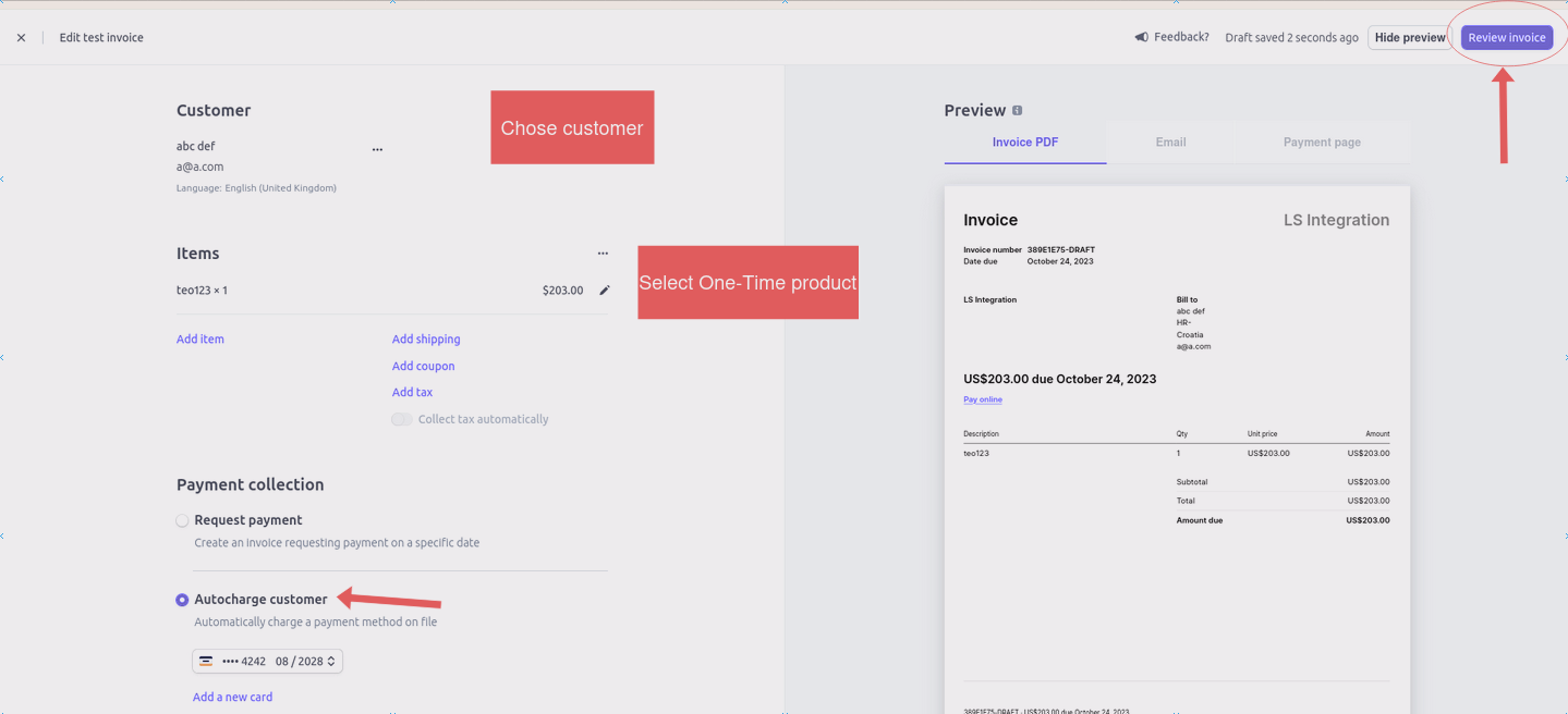 To generate an invoice, first select your customer and item (a one-time product). Then, set the payment collection method to 'Autocharge Customer.' Once you've reviewed everything, you can proceed to charge the customer.