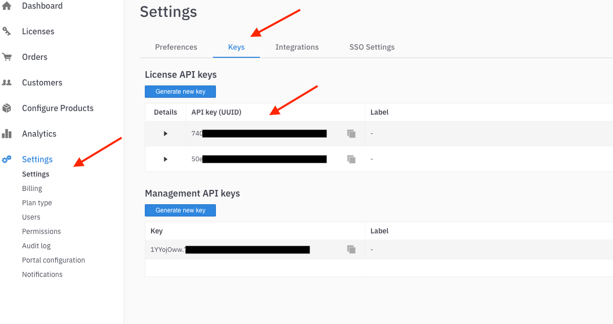 To retrieve the uuid (api-key) go to LicenseSpring → Settings → Keys