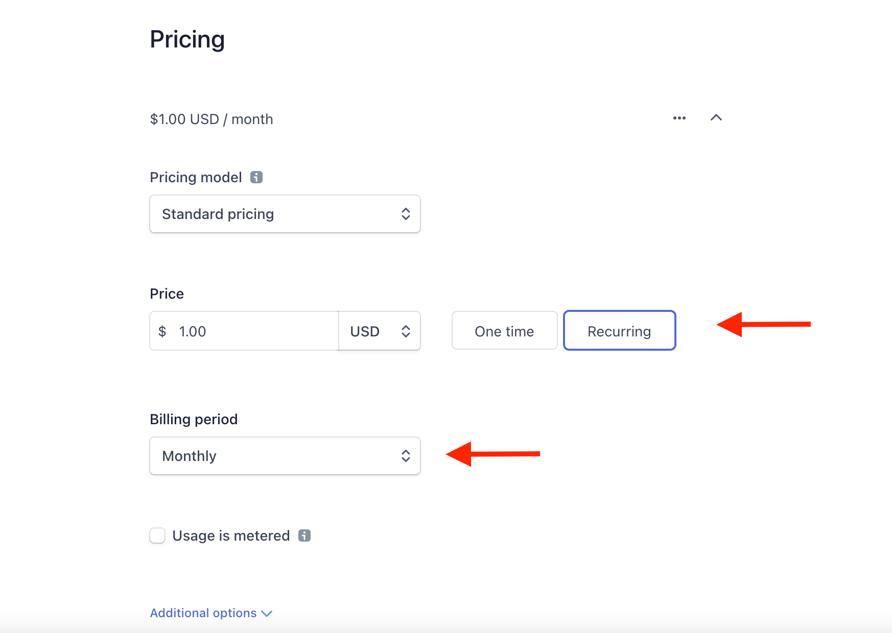 As a part of a product creation process in Stripe, you need to create a price for this product. If you select Recurring billing type, LicenseSpring integration will create subscription license type and use billing period from price settings as a valid duration in LicenseSpring. If you select One time billing type, LicenseSpring will use products default license type value or custom price attribute to set license type in LicenseSpring.