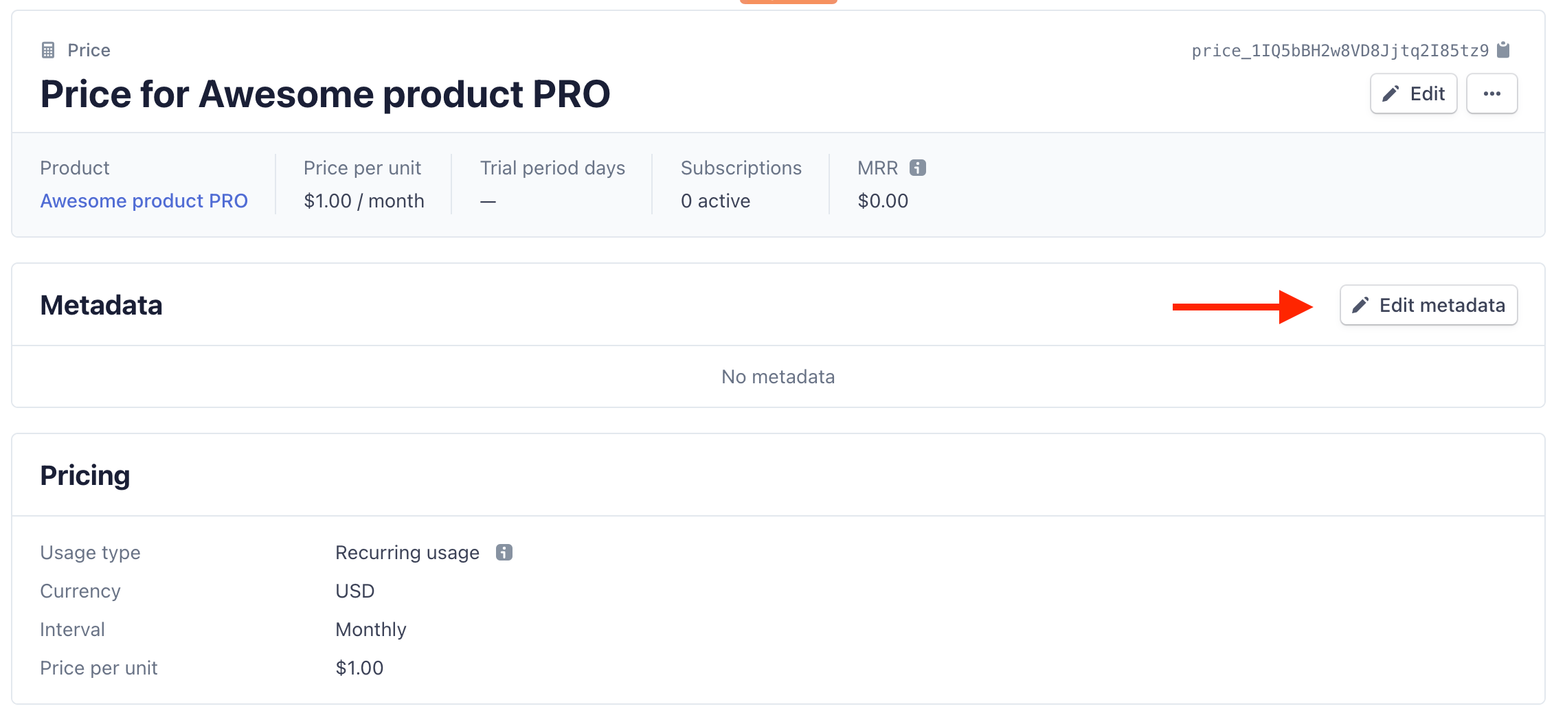 To properly create licenses LicenseSpring will use product price metadata custom attributes. To add attributes to the price metadata, go to Product page and select the price which you want to customize.
