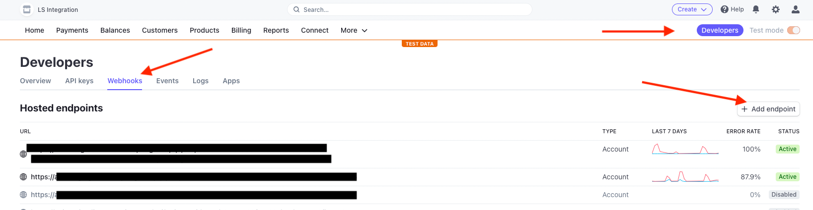 To create a webhook go to Developers -> Webhooks and click on Add endpoint.