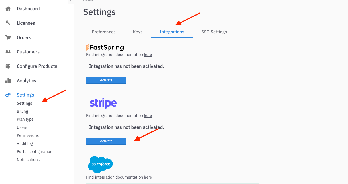 Save this key and add it to the LicenseSpring account by going to Settings -> Integrations. Press Activate for Stripe.