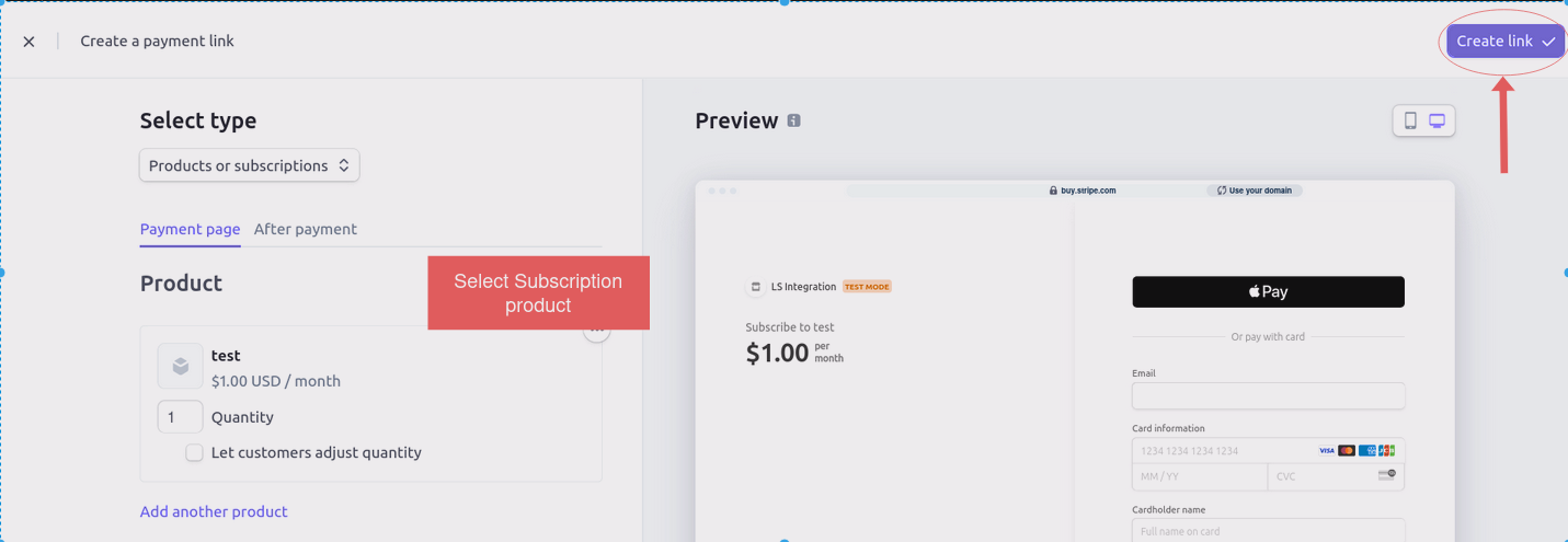 When dealing with subscription products, you should utilize a payment link. To do so, first choose 'Payment Link,' then select the product, and finally create the link.