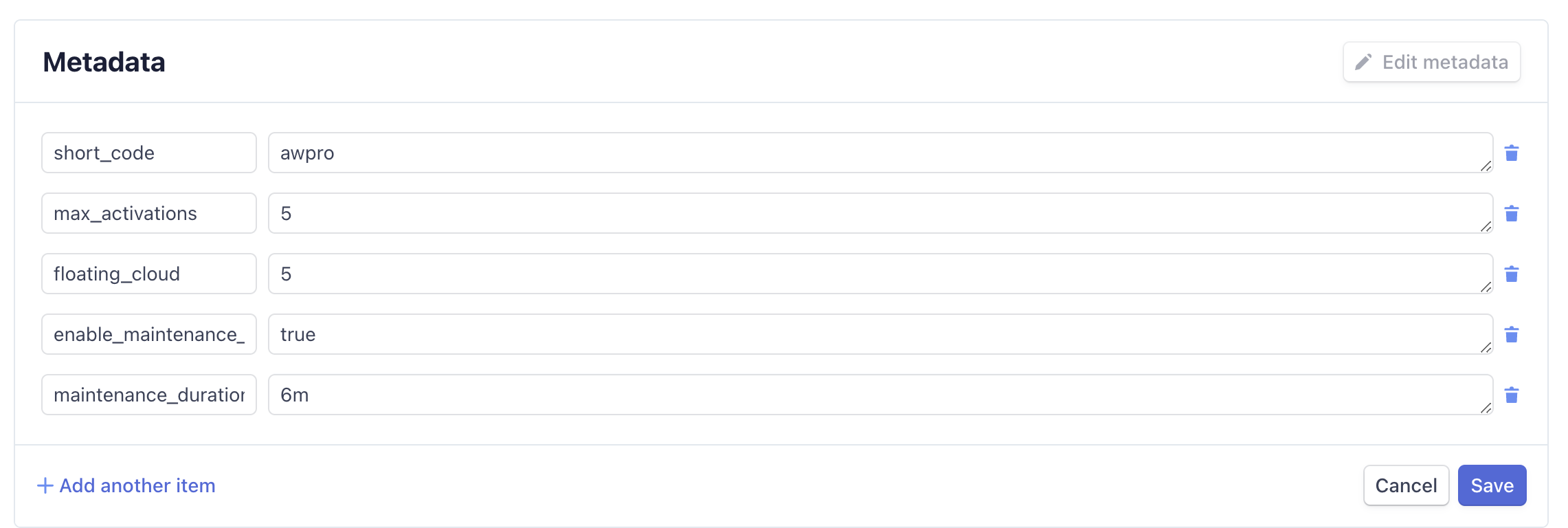 short_code- required. Add the product short code you configured LicenseSpring product with.max_activations- optional, INT. If this field is not included, the default from the product configuration in LicenseSpring will be used.floating_cloud- optional, INT. If this value is set licenses from this product will be created as floating cloud. This value also sets the total number of machines / users that can concurrently use a floating cloud license (Max simultaneous license users value in LicenseSpring configuration). Needs to be less than or equal tomax_activationsattribute value.license_type- optional, STRING. If this field is not included, the default license type from the product configuration in LicenseSpring is used (perpetual,time-limited,subscription,consumption). For recurring product prices, license type can be eithersubscriptionorconsumption. In the case of consumption licenses, the total consumptions are reset at the start of each billing interval.valid_duration- optional, STRING. If this field is not included, the defaultvalid_durationfrom the product configuration in LicenseSpring is used. The format for this isN[d/w/m/y]where N is number and option between d,w,m,y is possible (day, week, month, year - ex. "1y"). Not applicable for subscription licenses — subscription licenses will use billing period from product price settings.enable_maintenance_duration- optional, BOOL. Turns on maintenance capability. If not defined, default from LicenseSpring is used.maintenance_duration- optional, STRING behaves same as thevalid_durationfield.max_license_users- optional, INT, limits the number of users which can be added to the licenses — example: one license with multiple license users. Can be added only for products with user authorization method.is_license_manager- optional, BOOL, sets customer as a license manager. Useful on license-key based products where customer is not set as a license manager per default. If you are creating user based licenses, but do not want the customer to be assigned as a license manager, set this asfalse.assign_customer_as_user- optional, BOOL, customer will be automatically assigned to the license as a license user. Can be added only for products with user authorization method.unpaid_active_license_period- optional, STRING, used to define a period during which the licenses remain active even if they haven't been paid for yet. The format for this isN[d/w/m/y]whereNis a number andd,w,m, oryrepresents days, weeks, months or years respectively (e.g., "3d" for 3 days).added_days- optional, INT, specifies the number of days to extend the current subscription interval. Applicable only to subscription licenses.