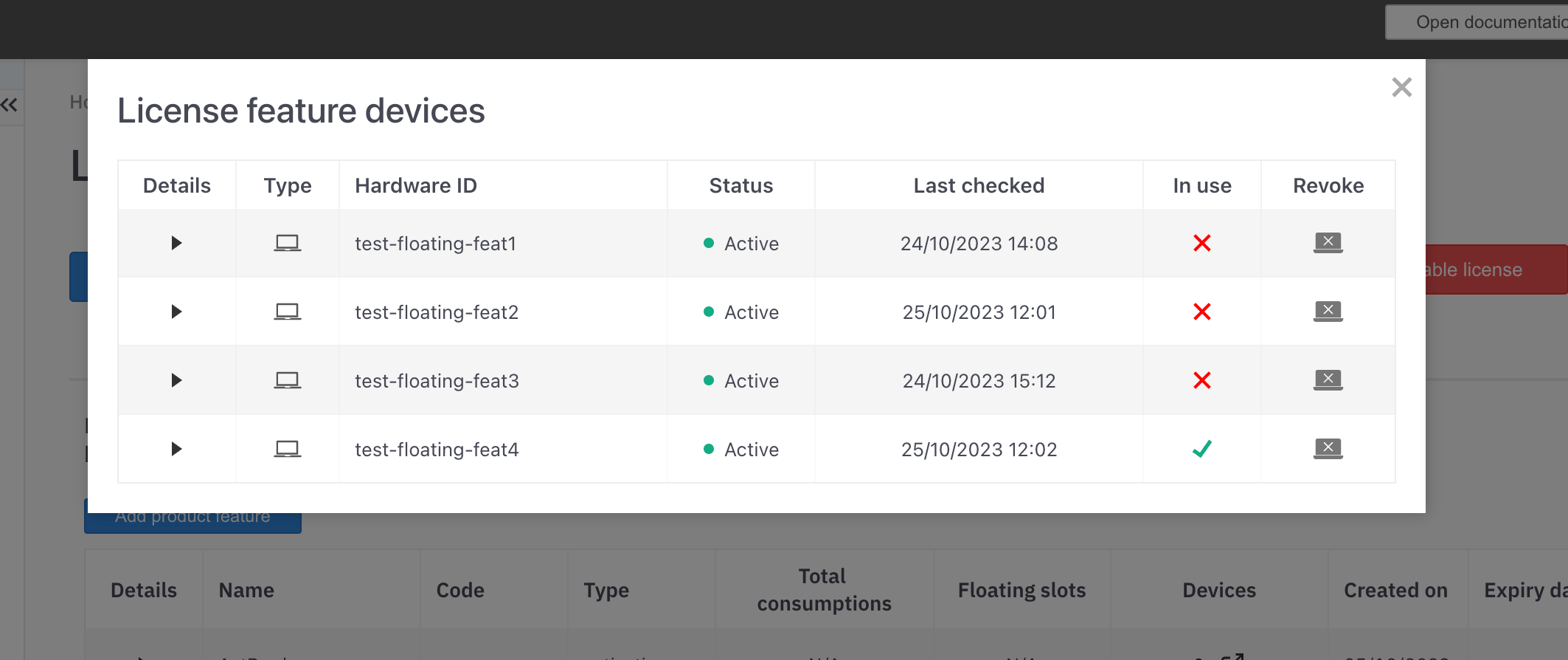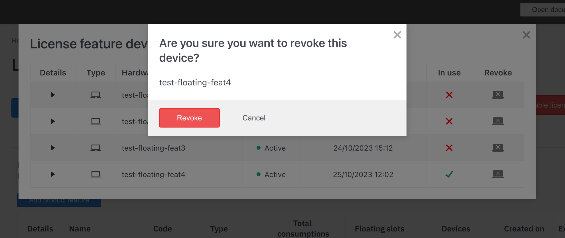 In use- Boolean representing if this device is using a floating feature slotRevoke- Action button which opens a confirmation window. On confirm that device will be released and the floating slot will be opened for another device. Only devices which are in use can be revoked using the UI.