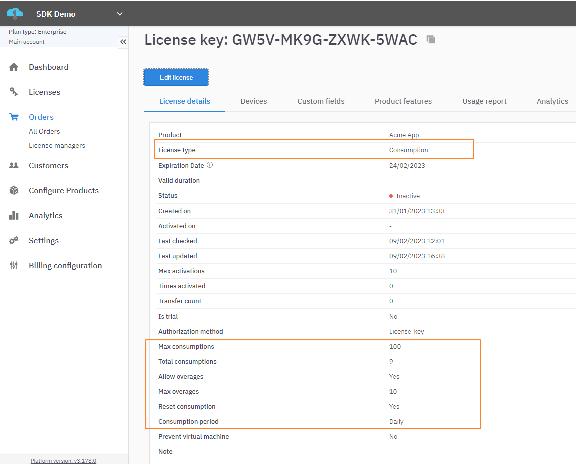 LicenseSpring also allows an ISV to meter the usage of an individual module or component by defining features consumptions, and adding them as part of the license entitlements.