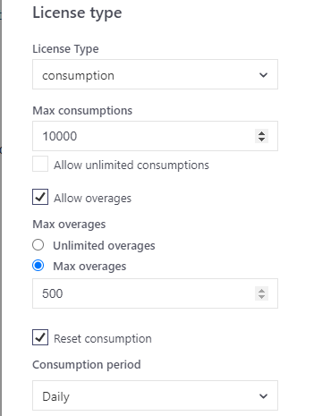 Overages: If overages are allowed, then the software vendor can specify a value that the license can exceed the value for max consumptions by. Otherwise, the max overages is 0.