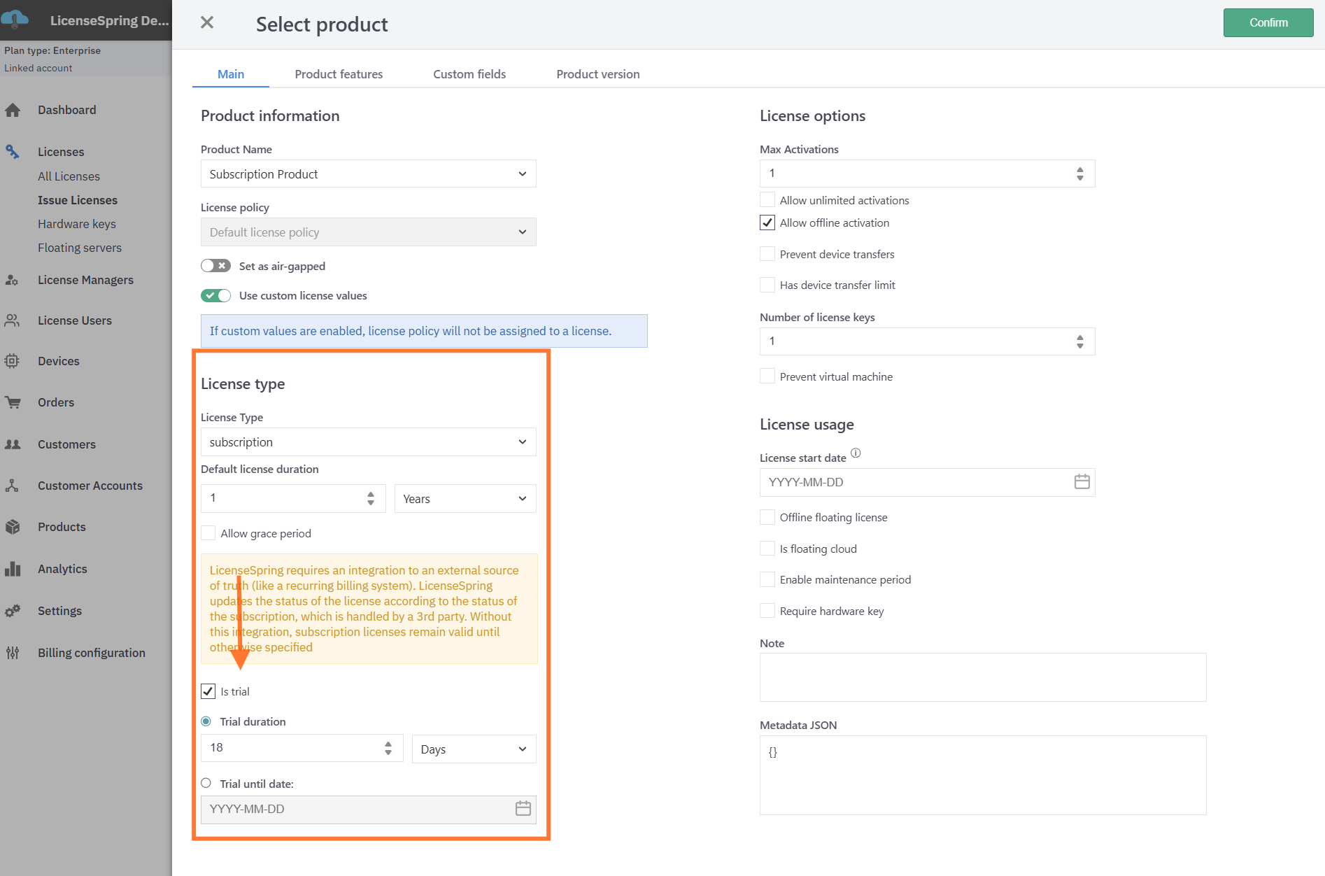 By using the is_trial Boolean designating a license is of type trial, you have a flag that allows you to configure your software in demo mode.