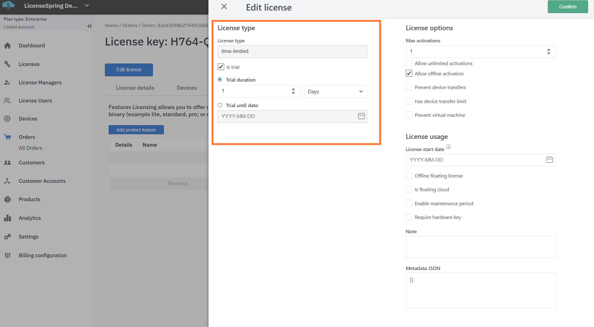 Any trial license can be edited to modify the license so that it is no longer a trial license, but a full license for your product. To do so: