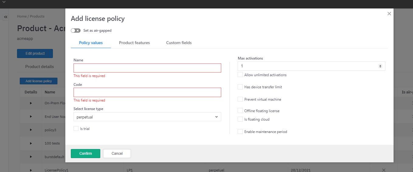 Name— RequiredCode— Required, immutableLicense type— Required, can be Perpetual, Time-limited, Subscription, or ConsumptionIs trial— Optional, Boolean determining whether the license issued is a trial licenseMax activations— Must be a positive integerAllow unlimited activations— BooleanHas device transfer limit— Whether you wish to control the number of times a license can be moved from one device to anotherPrevent virtual machine— Boolean value sent to the SDKs to detect and block apps running in virtual environmentsOffline Floating license— Boolean, setting entitlements for a floating server that is deployedis floating cloud— Boolean setting concurrency over HTTPEnable Maintenance period— Set a maintenance window which starts counting after the initial activation of the license