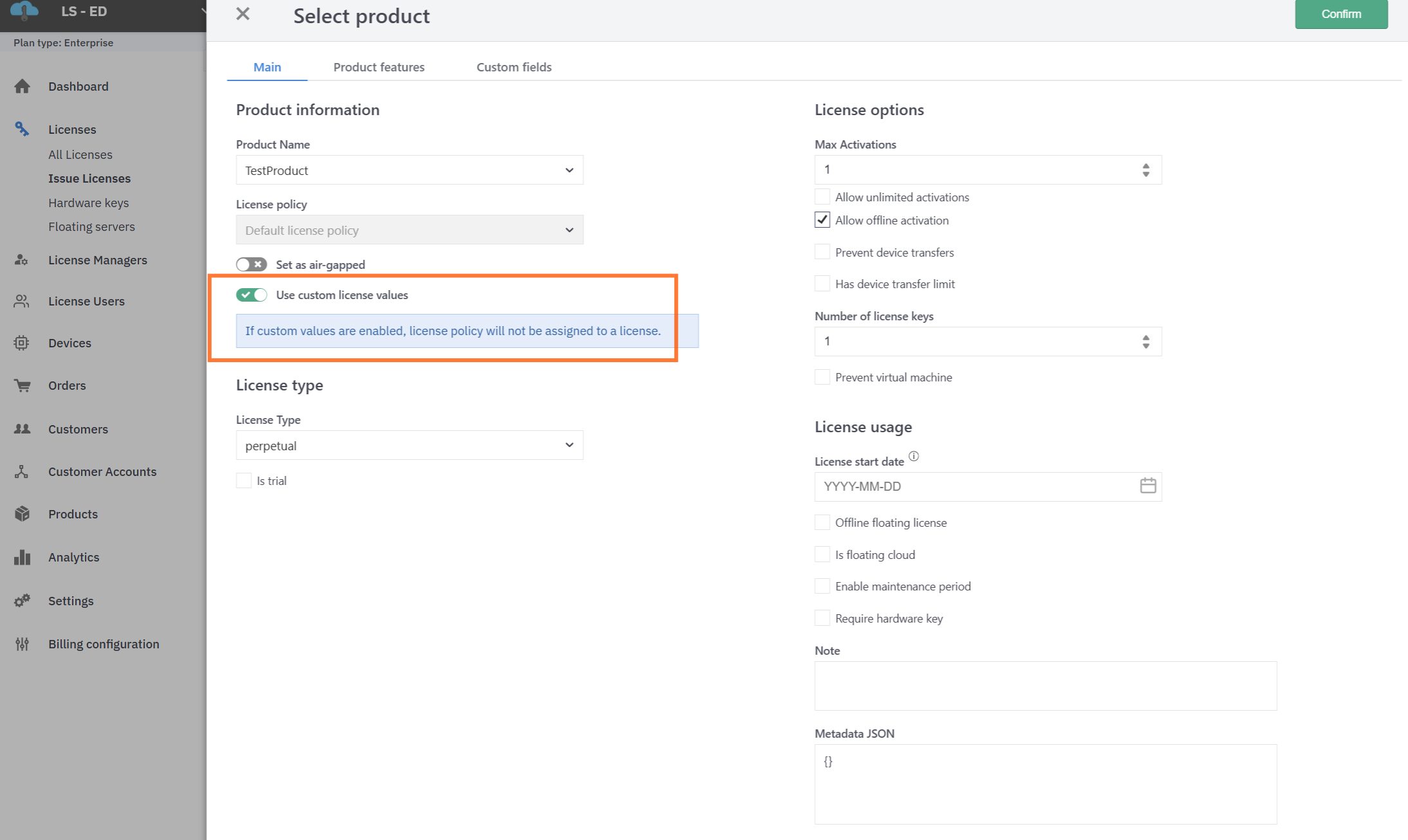 If you wish to use the License policy as a starting point when configuring the license you are issuing, then enable Use custom license values. The editor will start with all of the options configured in the license policy: