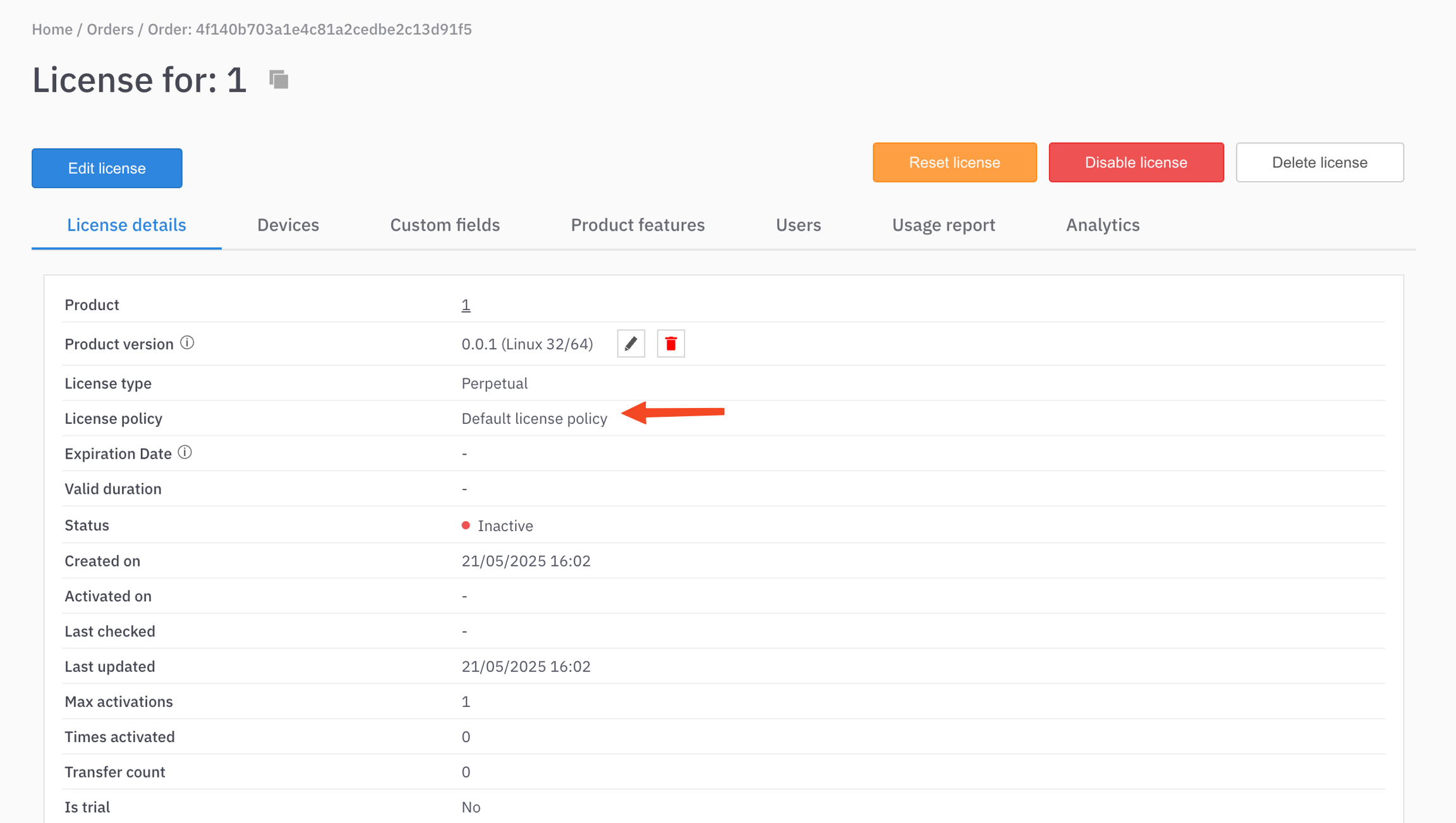 When a license is created using a specific license policy, the policy identifier is stored and made available via both API responses and the user interface.