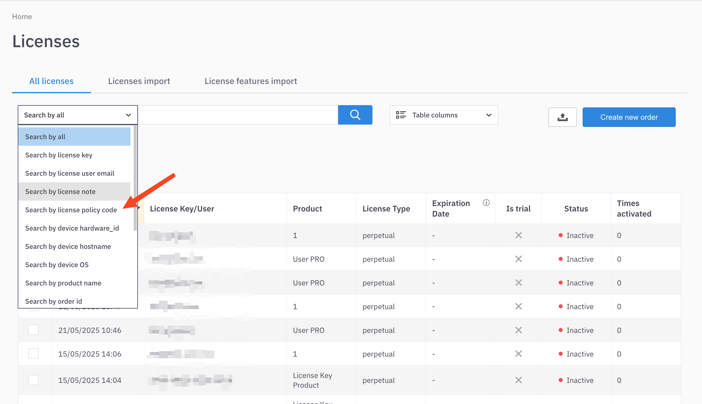 License search functionality includes an option Search by license policy code and results include all licenses issued using specific policies, enabling behavior similar to product SKU filtering in e-commerce or inventory systems.