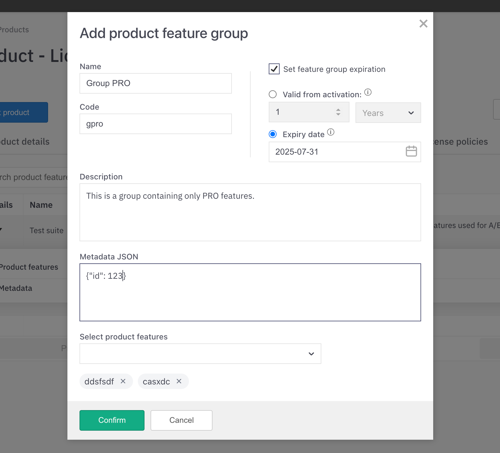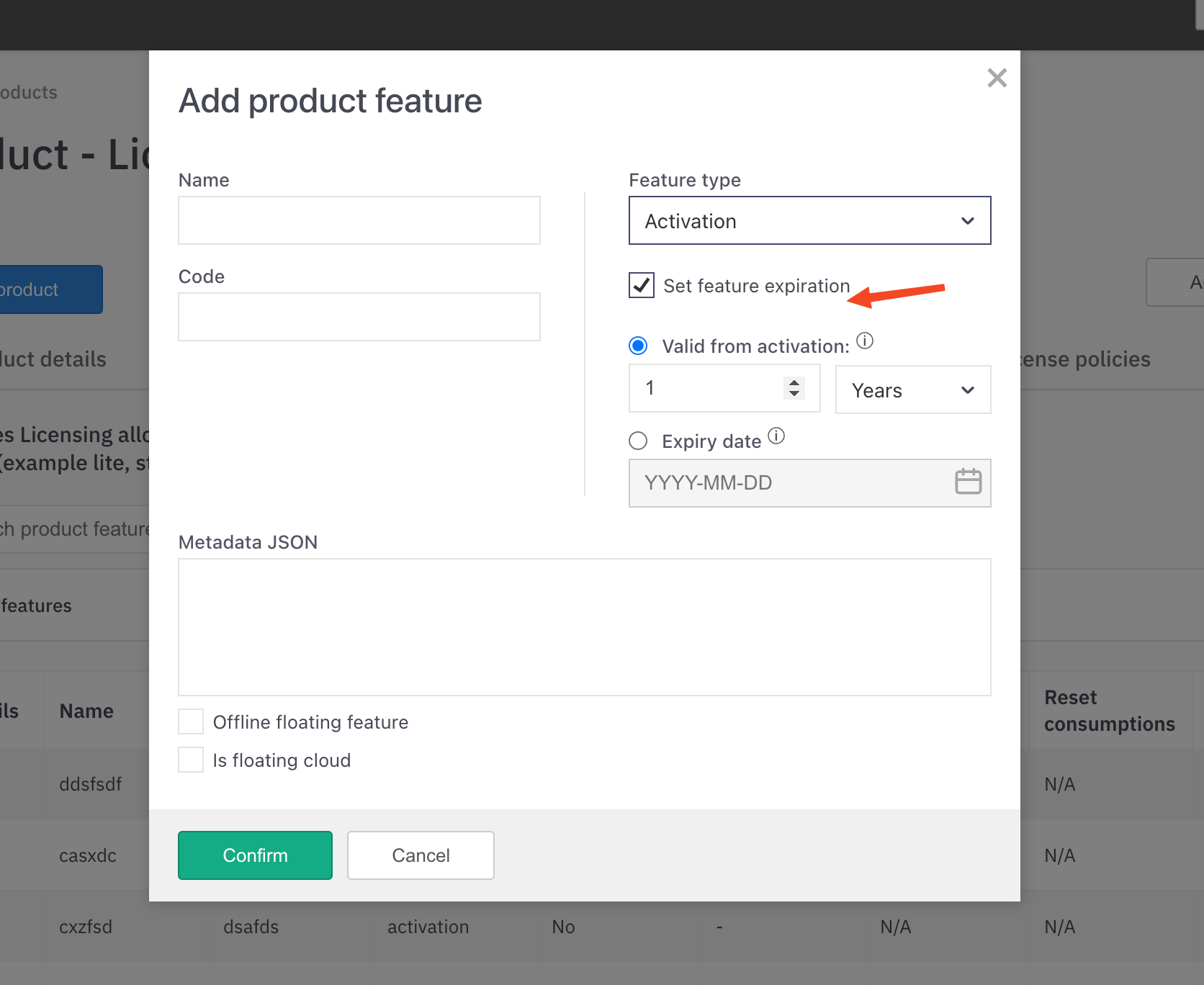 Optionally you can define an expiration for the features. You can either set expiration to a specific date (Expiry date) or you can set a Valid duration to a feature which is then used to calculate a specific expiry date at the time of the first license activation.