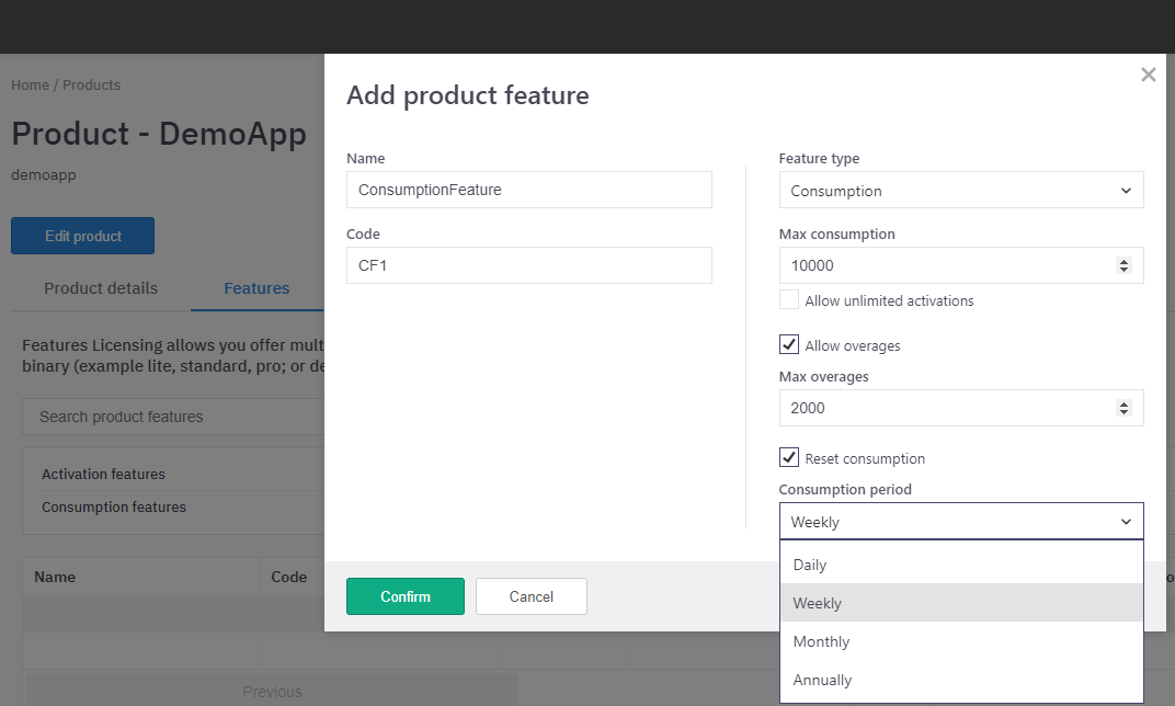 If the feature is of type consumption, set the default value for Max Consumption, the Value for Max Overages, as well the time interval for which the allowances should reset