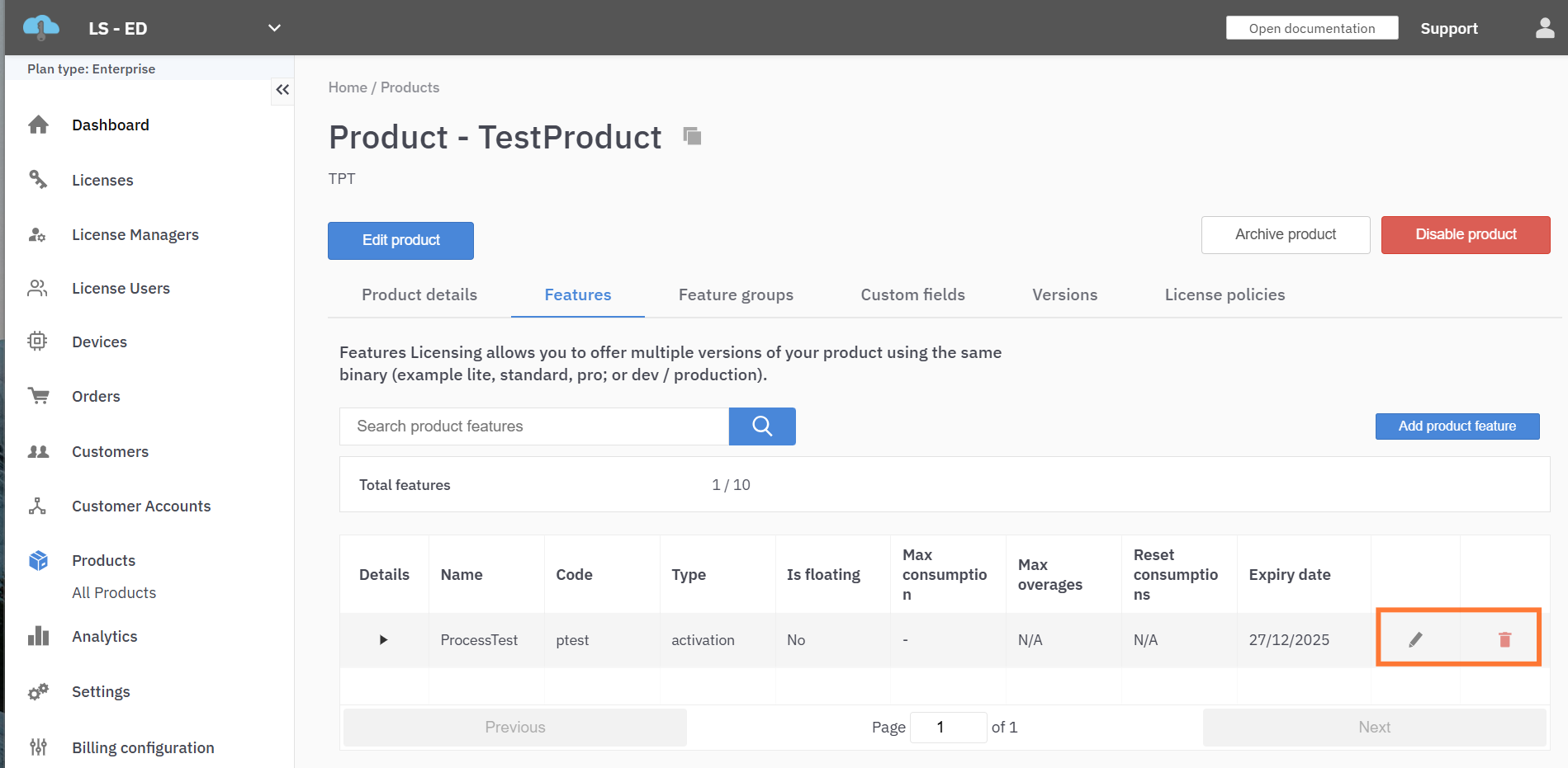 To edit a product feature, go to the features list and click on the Pencil icon on the row for that product feature.