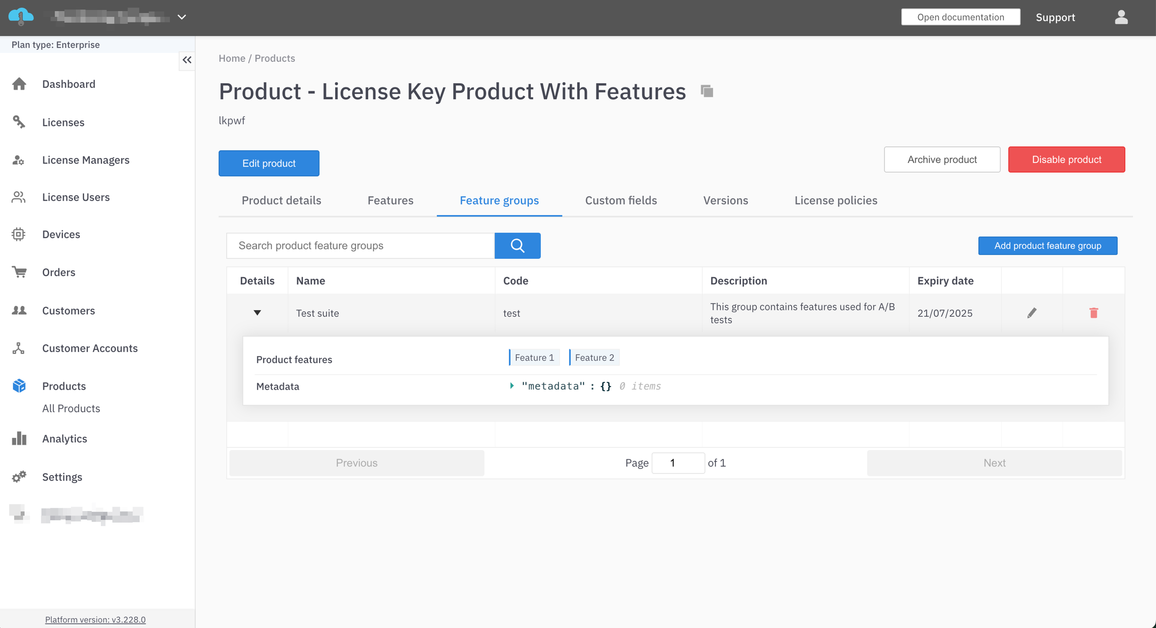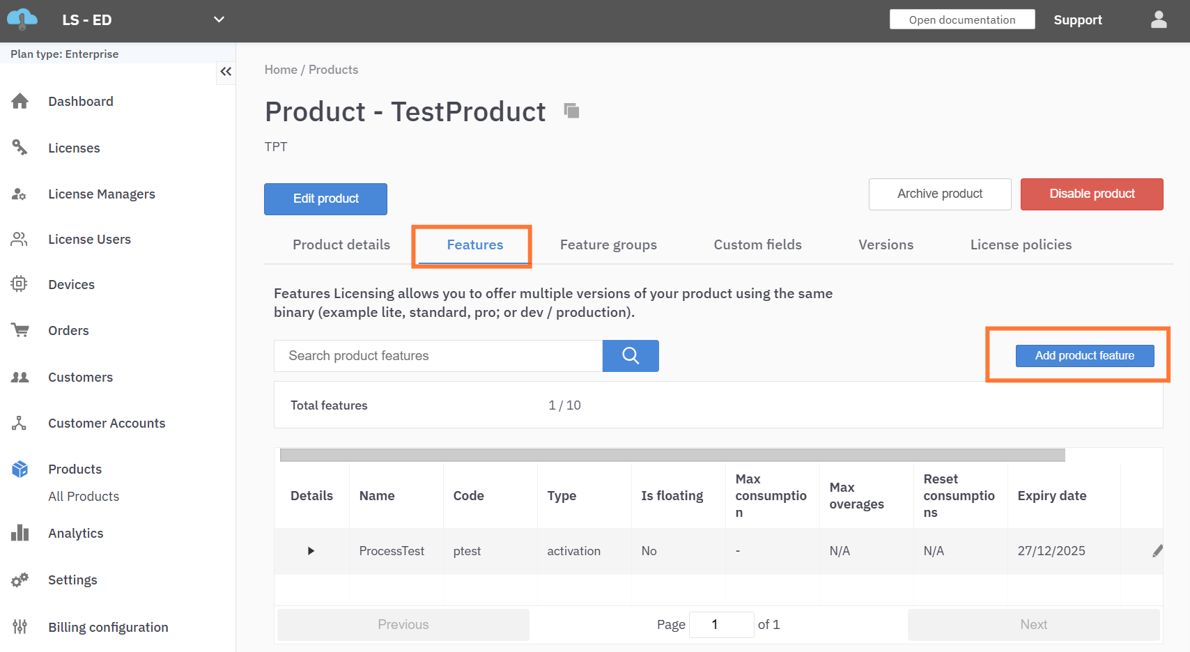 If you delete a product feature, it will be removed from any licenses that are currently using it. Adding the feature back to the product will not add the feature back to the licenses. LicenseSpring does not have any concept of archiving features!