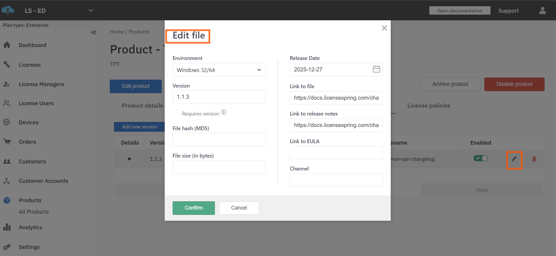 LicenseSpring supports linking licenses to specific product versions, allowing fine-grained control over license applicability. This enables scenarios where a license should only be valid up to a designated version of a product.