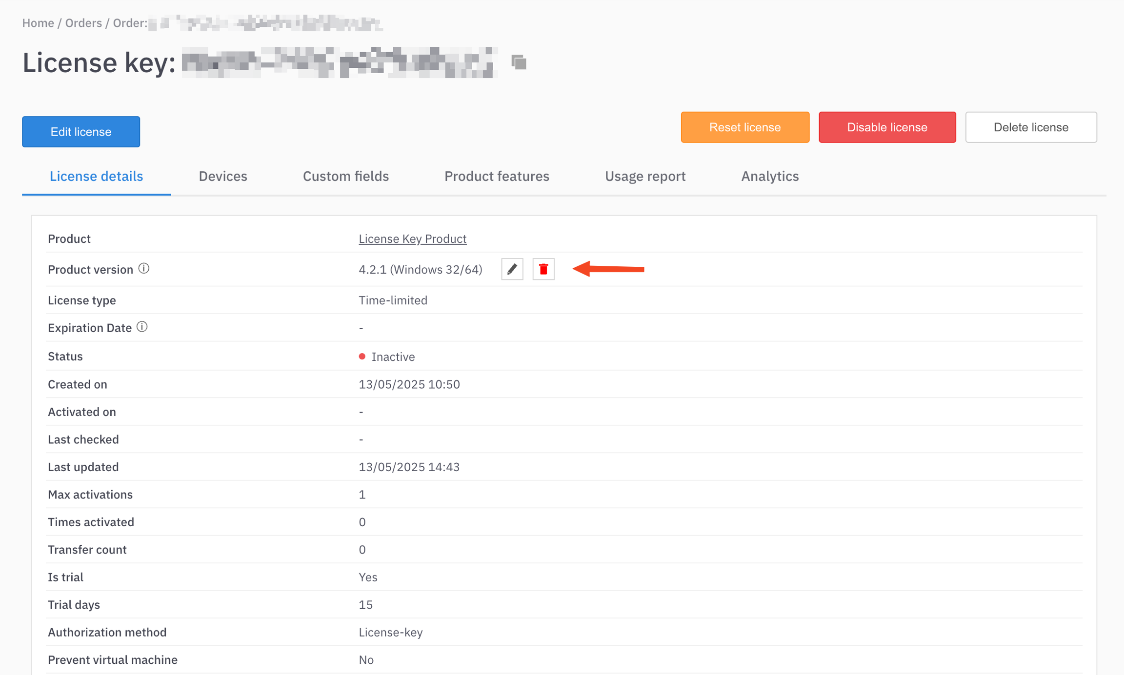The LicenseSpring service can be configured to return product version information on Activation, license checks, and other webhooks through the License API.