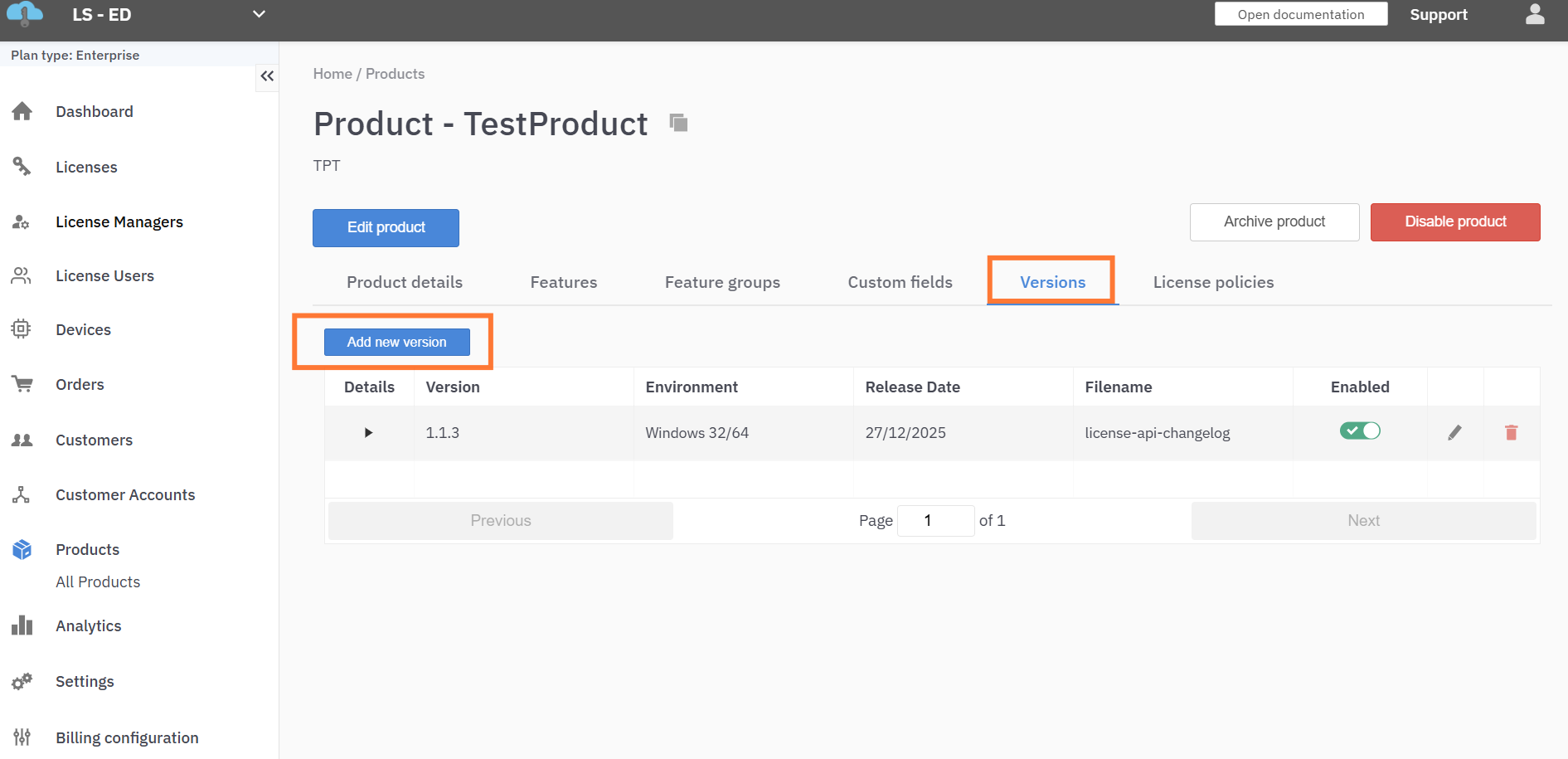 To add a new version of your product, open the product detail page, click the Versions tab, then click "Add new version".
