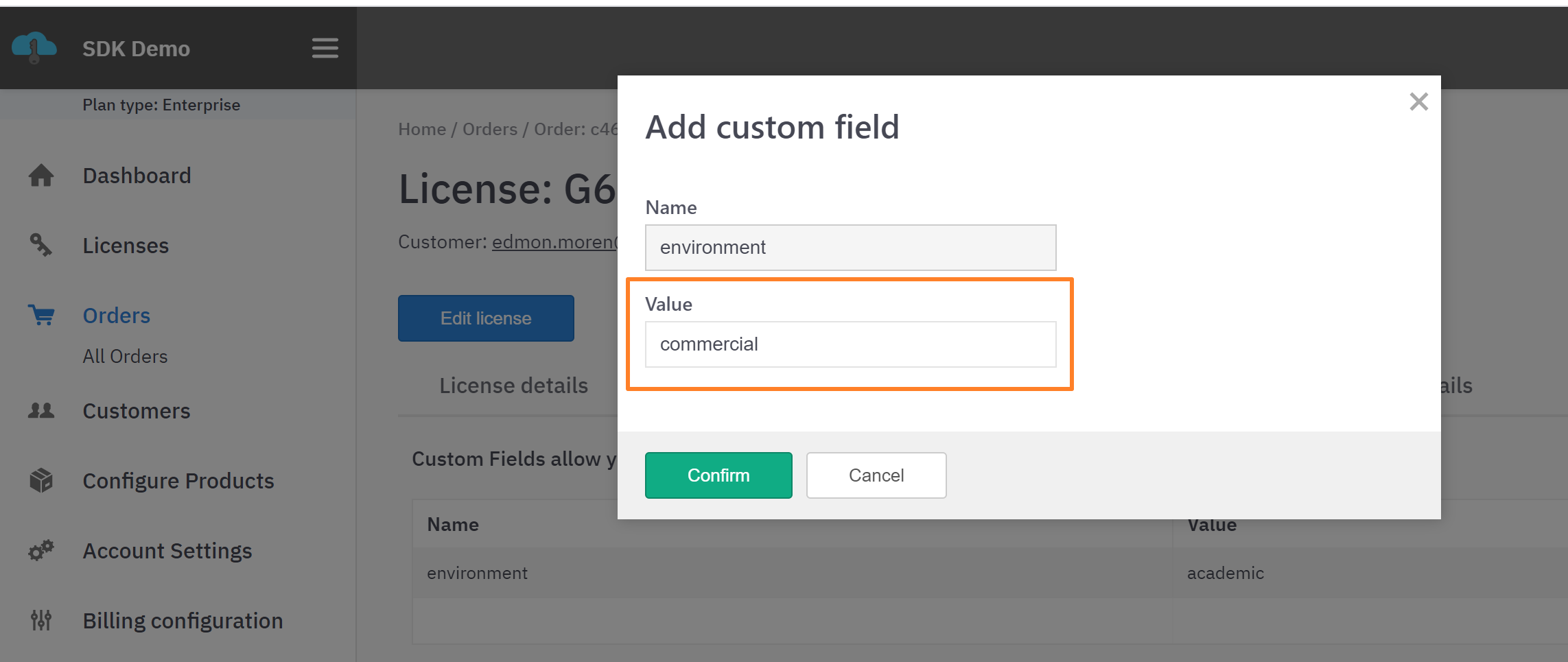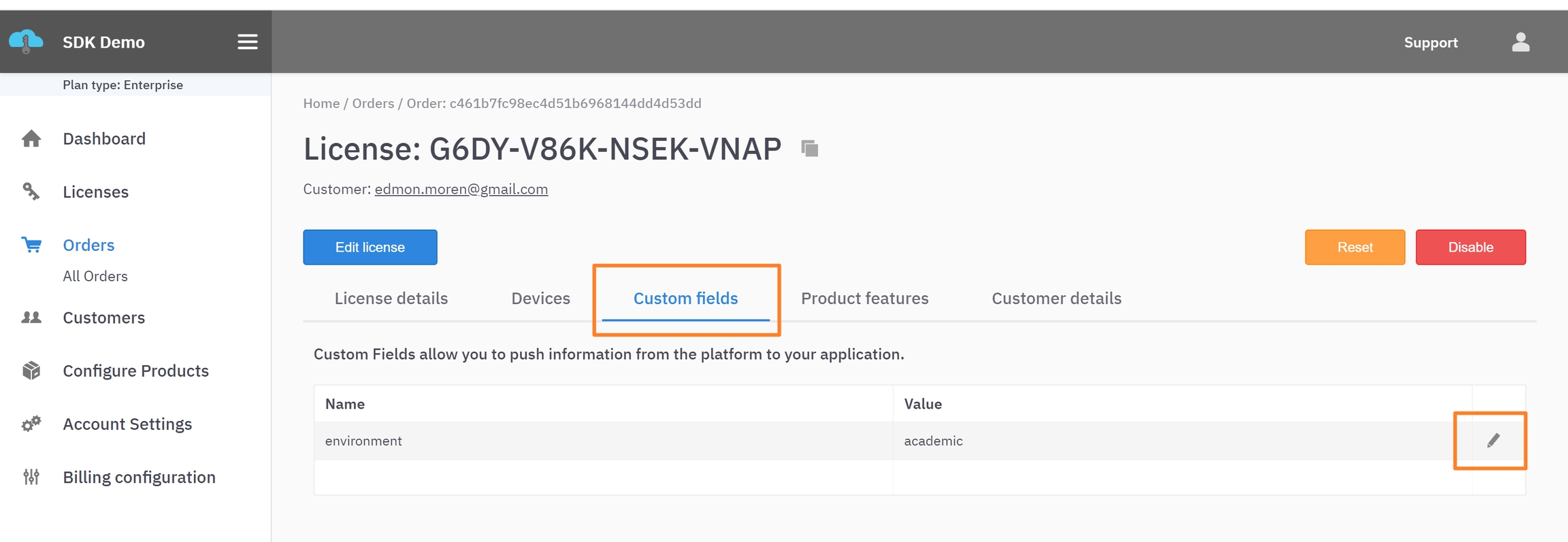 Utilize the pencil tool to trigger a pop-up window, enabling you to modify the value associated with the custom field for that specific license.