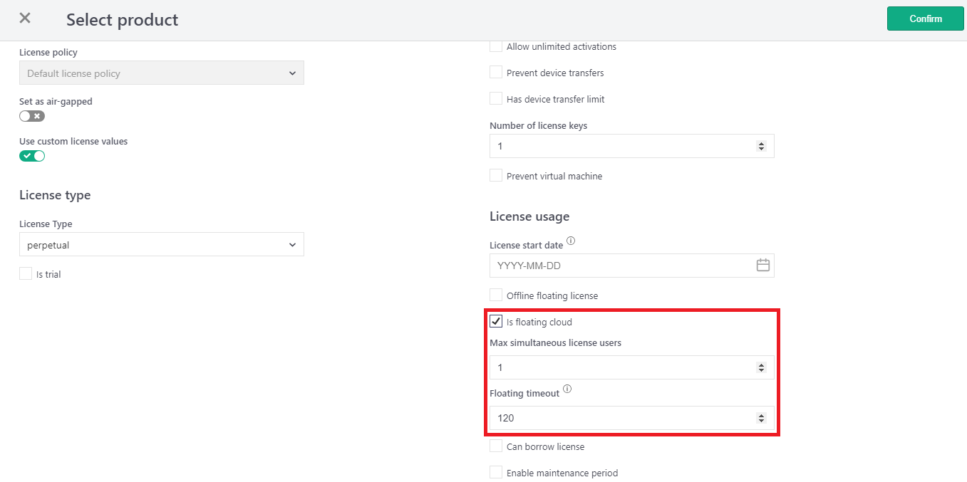 The default maximum simultaneous license users and floating timeout period are set during product creation.