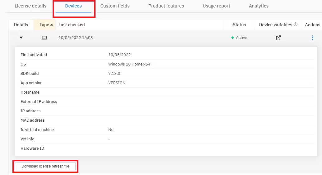To perform an offline license refresh, locate the license on the LicenseSpring Platform and access the Devices tab.