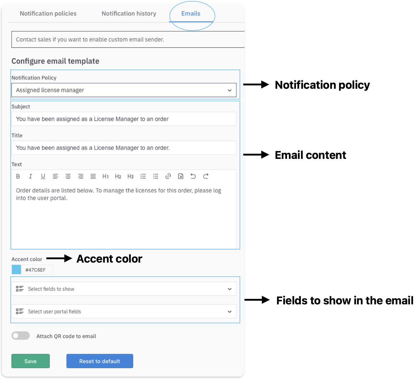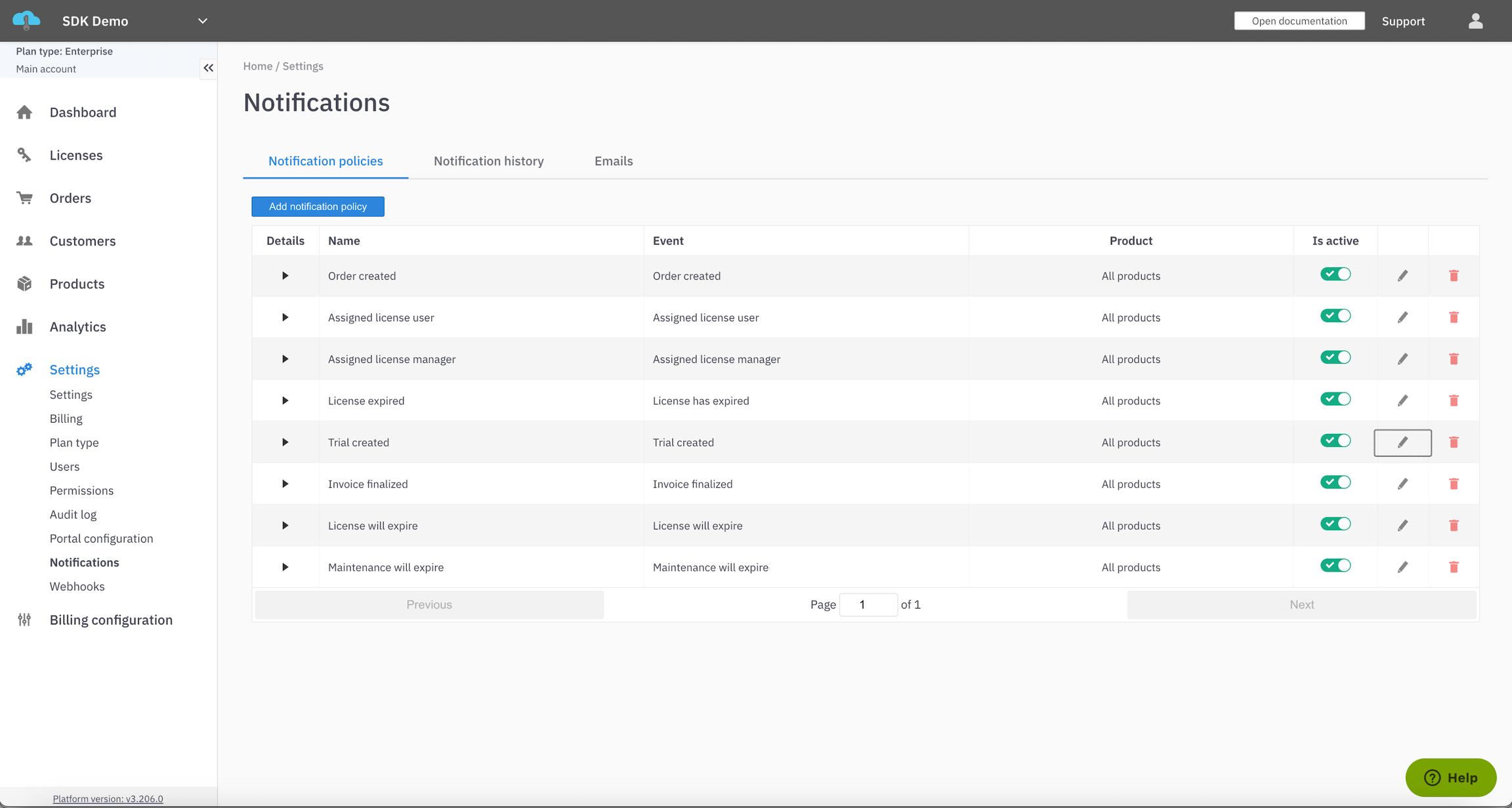 LicenseSpring allows the software vendor to send email notifications triggered by specific events to designated recipients. The content of these emails can be customized, as well as the sender email.