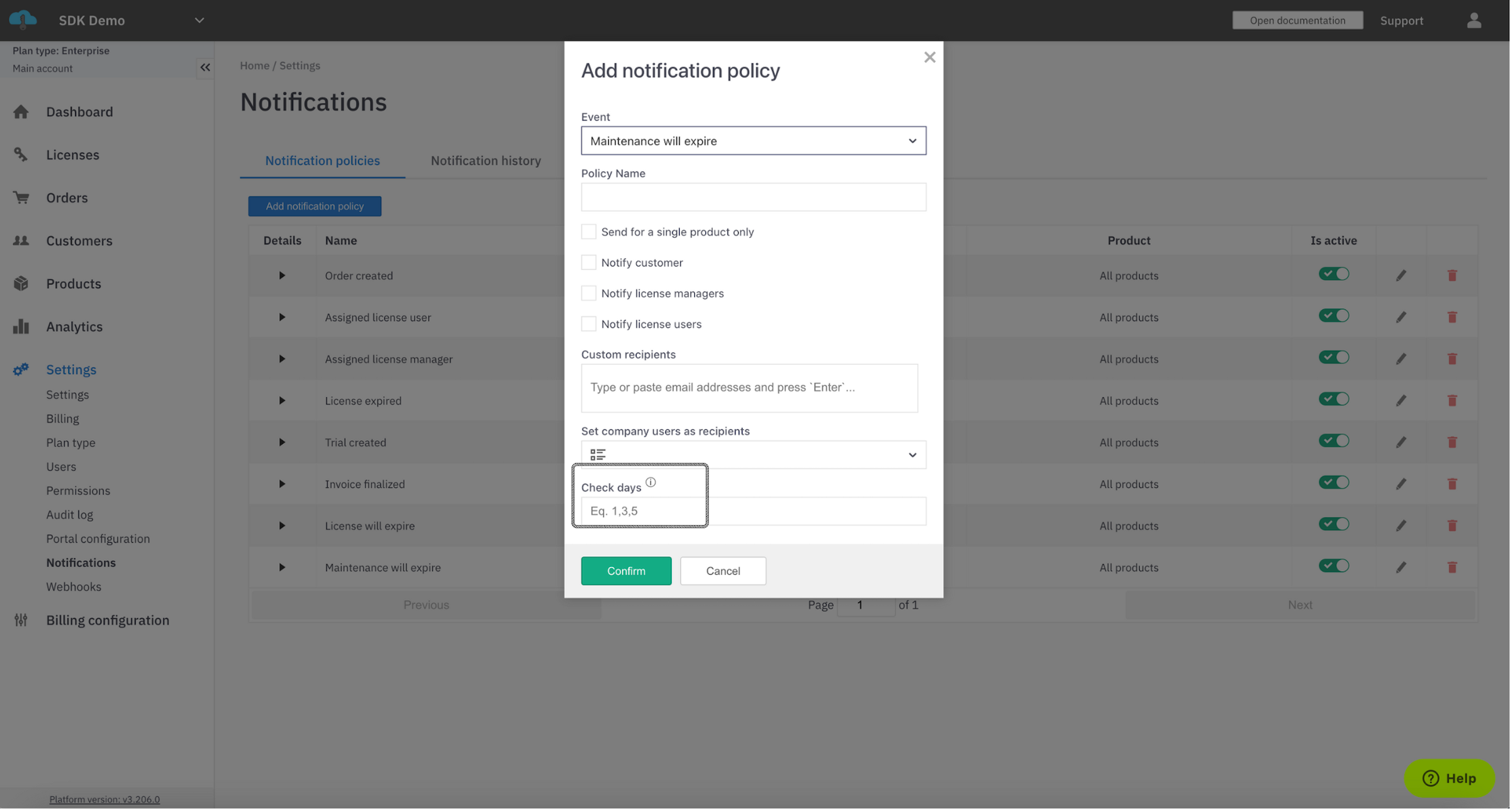 The "License will expire" notification allows you to send an email a certain number of days before the license expires to desired recipients. You can specify several days prior to expiry that you would like the email notification to be sent out:
